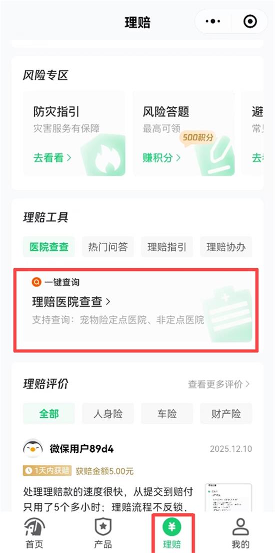 在就诊前,可提前查询所购保险纳入的合作宠物医院清单,避免“白跑一趟”。除了通过保险合同或平台产品介绍页面查看,像腾讯微保还在其官方小程序中特意增加了“理赔医院查查”在线工具,为用户提供了更快捷的查询路径,这一工具能帮助宠物主一目了然地看到附近哪些是定点医院,哪些是非定点医院,还有清晰的医院地址,从源头上杜绝了因医院选择错误导致的理赔失败。